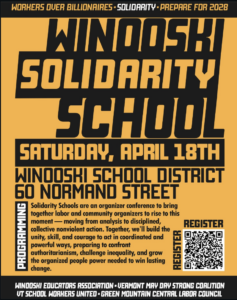 Join us for the Winooski Solidarity School on Saturday, April 18 at the Winooski School District, 60 Normand Street.